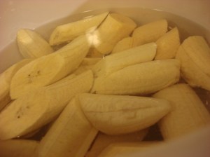 Stir garlic, water and salt in a bowl. Slice the plantains into ½ inch chunks, on the bias, and place slices in bowl of salted water. Soak for 15 minutes to one hour. Drain on paper towel.