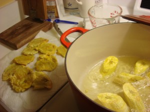 Heat the oil in a heavy pot or pan. When the oil is shimmering, add as many plantain slices as will fit comfortably. Fry until golden (really golden – not just beige) turning with tongs.