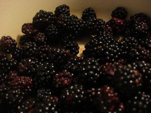 You know which berries are ready because they are dark, dark, dark (which I suppose explains why they are called blackberries; I am a genius) and also, when you are harvesting, the ripe ones don’t resist a very gentle tug, but slip right off the bush into your fingers sans stem and core. If they resist, it is not because they are being difficult, but because they simply do not want to deliver themselves to you at anything less than their peak.