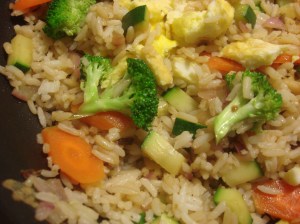 Stir-fry, therefore, is perfect. It uses everything up (virtue), fulfills my veggie quota (more virtue), and gives us a vacation from my usual seasonings to go more Asian (variety). And now that I know the easy secret of how to get the egg bits looking and tasting great, well I think I am positively gourmet. It’s already vegetarian; vegans can skip the eggs and pan-sear super-firm tofu instead.