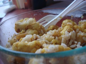 I made an executive decision. The manager’s special cauliflower was not going towards another vain attempt to interest Leandro in expanding his List after which I would be obligated to eat all of it. No. It was curry time. And so, aloo gobi (cauliflower and potatoes) without the aloo (potatoes). This is, of course, not in any way to be judged as an attempt at authentic Indian food. In fact, I had a handful of peeled apple slices left over from the little guy’s lunch, and threw them in for sweetness. It was more than tasty enough and served me not just for a dinner, but a couple of microwaveable office lunches.