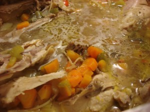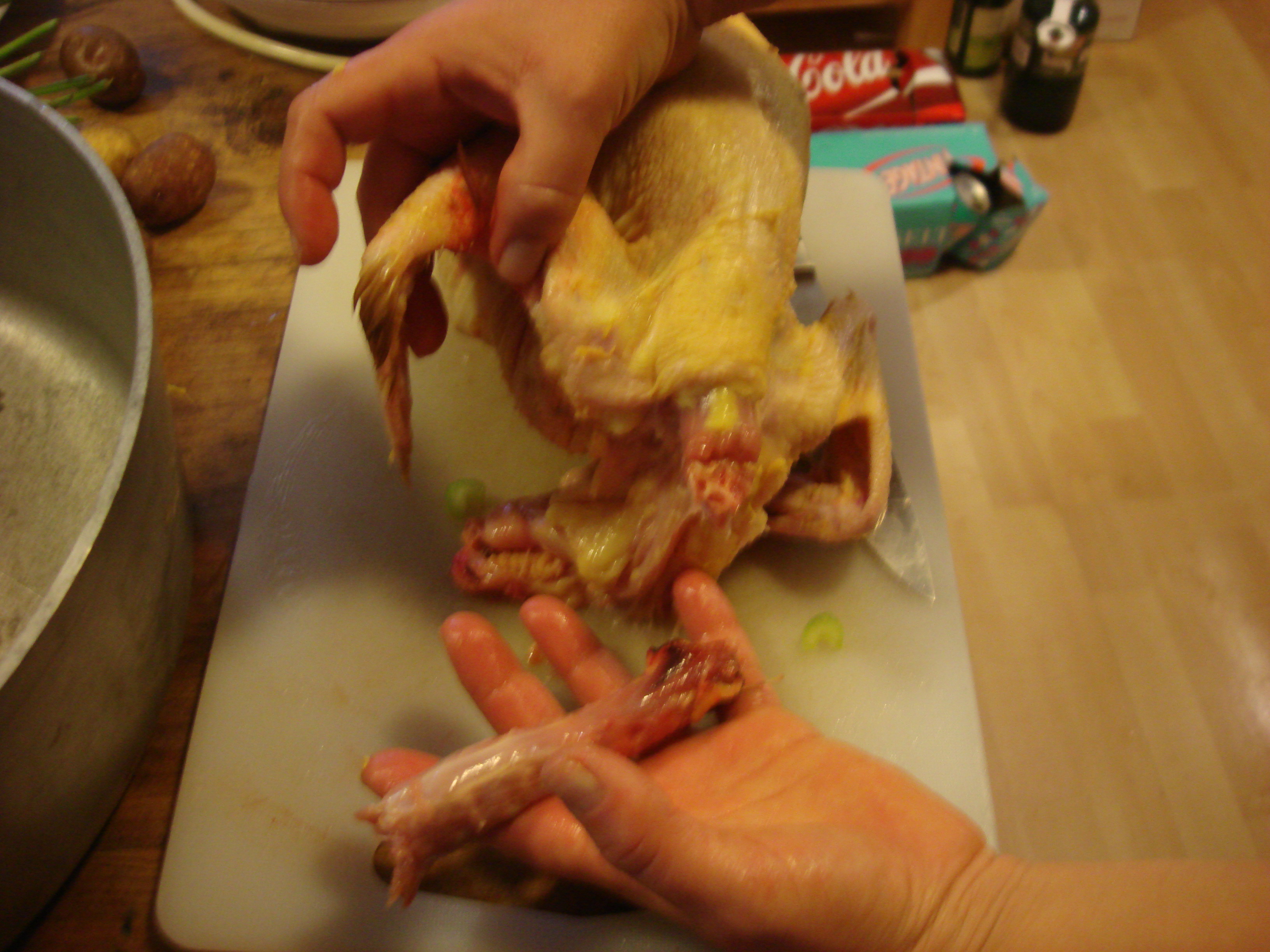 So I decided that tough times call for chicken noodle soup criollo style. I took the bird out a day before the storm to defrost in the fridge. It wasn’t quite defrosted, but the cold made it easier to remove the skin.