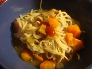 Place all ingredients EXCEPT noodles in a big pot. Bring to a boil, then lower to a lively simmer and cook at least until chicken is cooked through, but preferably for at least an hour so the meat is falling off the bones. Add noodles five to ten minutes before serving.