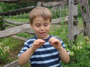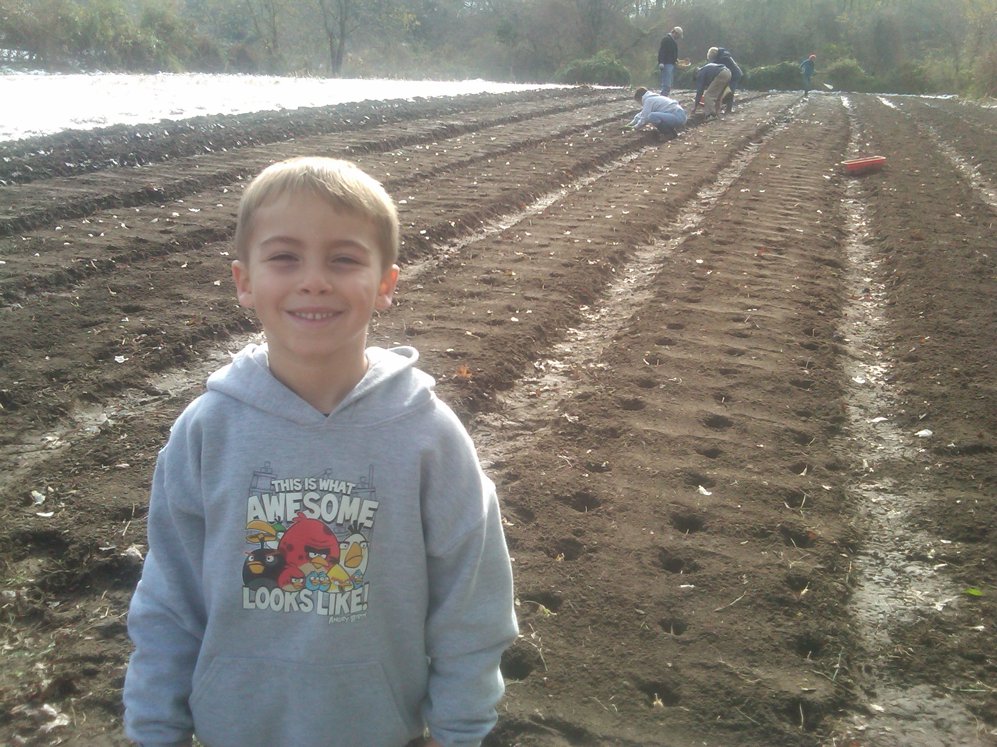 Between the community-supported agriculture gardens that we have belonged to since before he was born (I can still remember the period of time that I was trying to get pregnant, sitting quietly in the garden farm, pulling weeds, and thinking fertile thoughts), and the increasing numbers of vegetables we are growing in our backyard, my son really knows where food comes from. And thanks to this, even though there are still loads of fresh vegetables he won’t eat, he WILL eat peas off the vine, kale, spinach, chard, as a direct result of being on the farm. This weekend we helped plant garlic at Restoration Farm; this time, ironically enough, I was helping little Ada plant her row; big Leandro didn’t need me because he was planting bulbs all by his farmer-boy self with the big people.