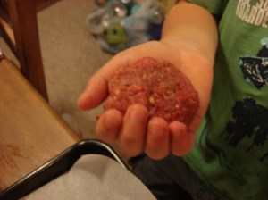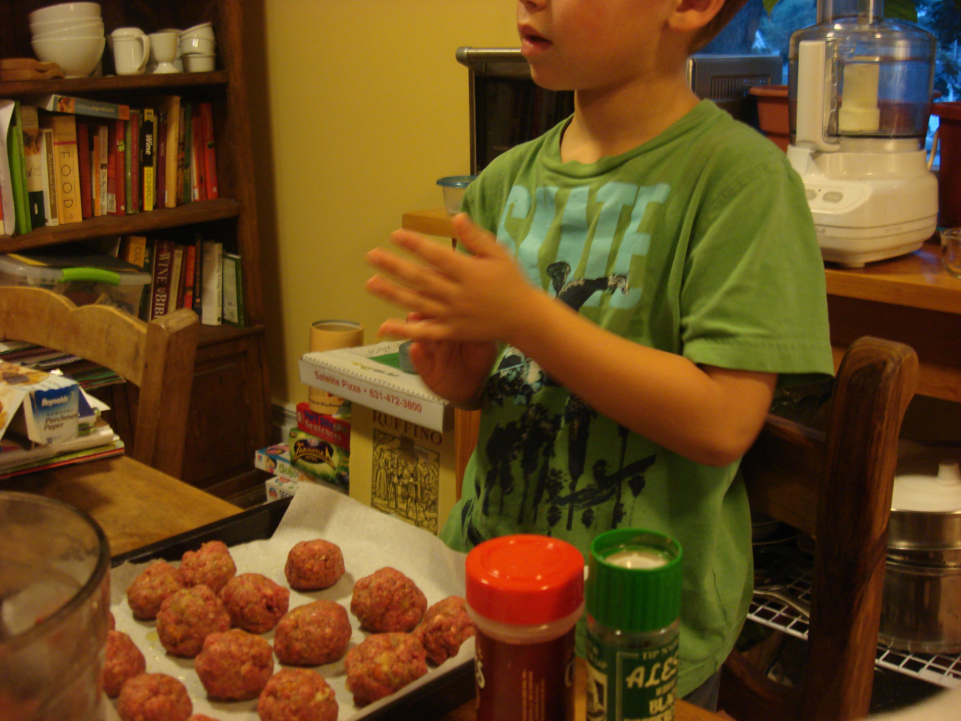 Leandro makes the meatballs around here these days. Great for the fine motor skills, great for togetherness, great for kitchen efficiency. They may not all end up the same size, but does that really matter?