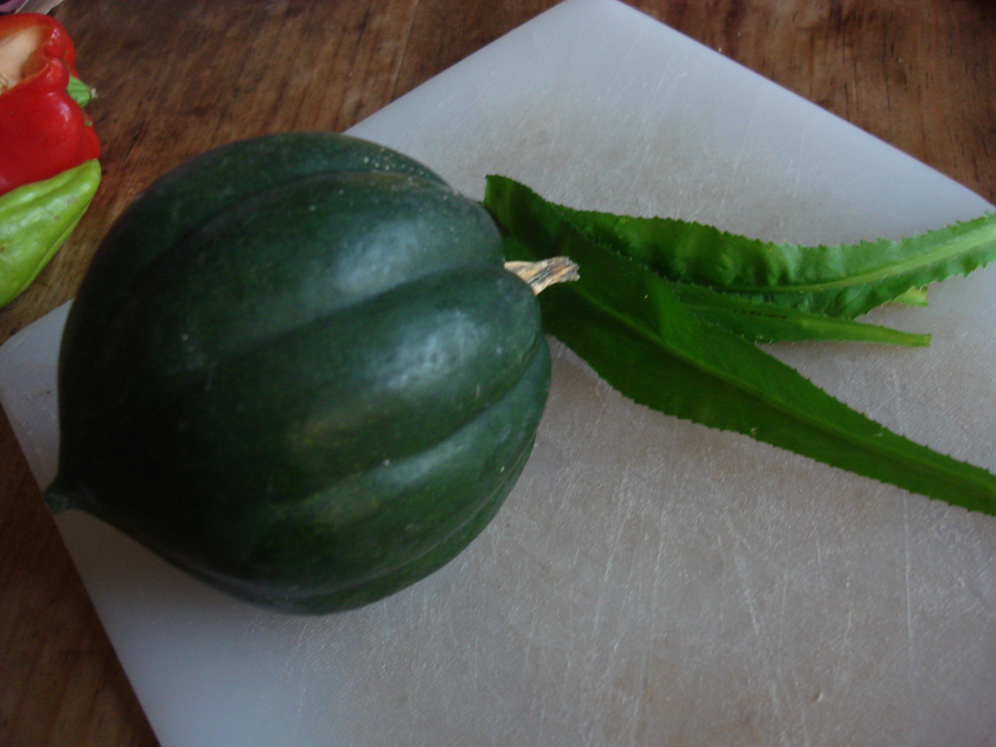 Acorn squash makes a decent substitute for calabaza. Shown here with recao from my container garden!