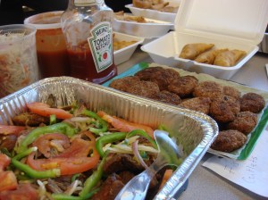 So after a major in-class essay-writing assignment (which I still have to grade before Monday. Yikes!), we unwrapped our potluck offerings, did a little heating up in the office microwave, (one student even plugged in her slow cooker!), and tucked in.
