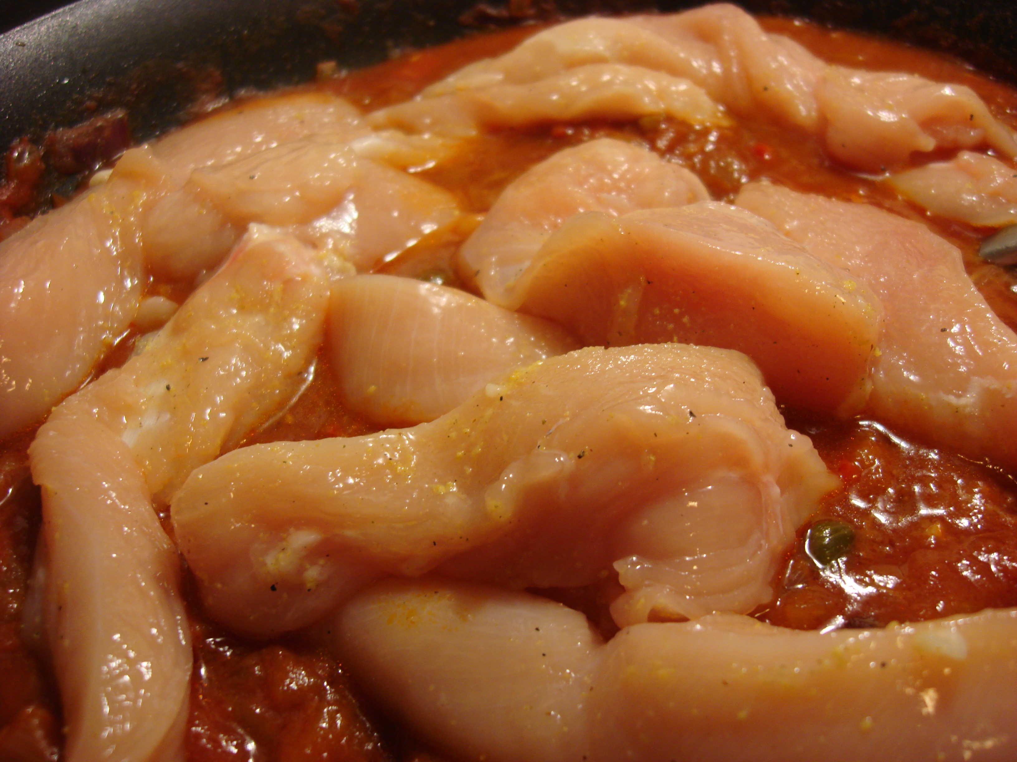 When the sauce is ready, add the chicken to the skillet. Stir or turn to coat. Bring to a lively simmer, then lower to medium-low, stirring occasionally (cubes or strips) or flipping once or twice (whole breasts). The chicken will cook through in about 8-10 minutes if you are in a hurry, but try to cook it for longer at lower heat and the meat will become more tender. Salt and pepper to taste and serve with Perfect White Rice (see below)