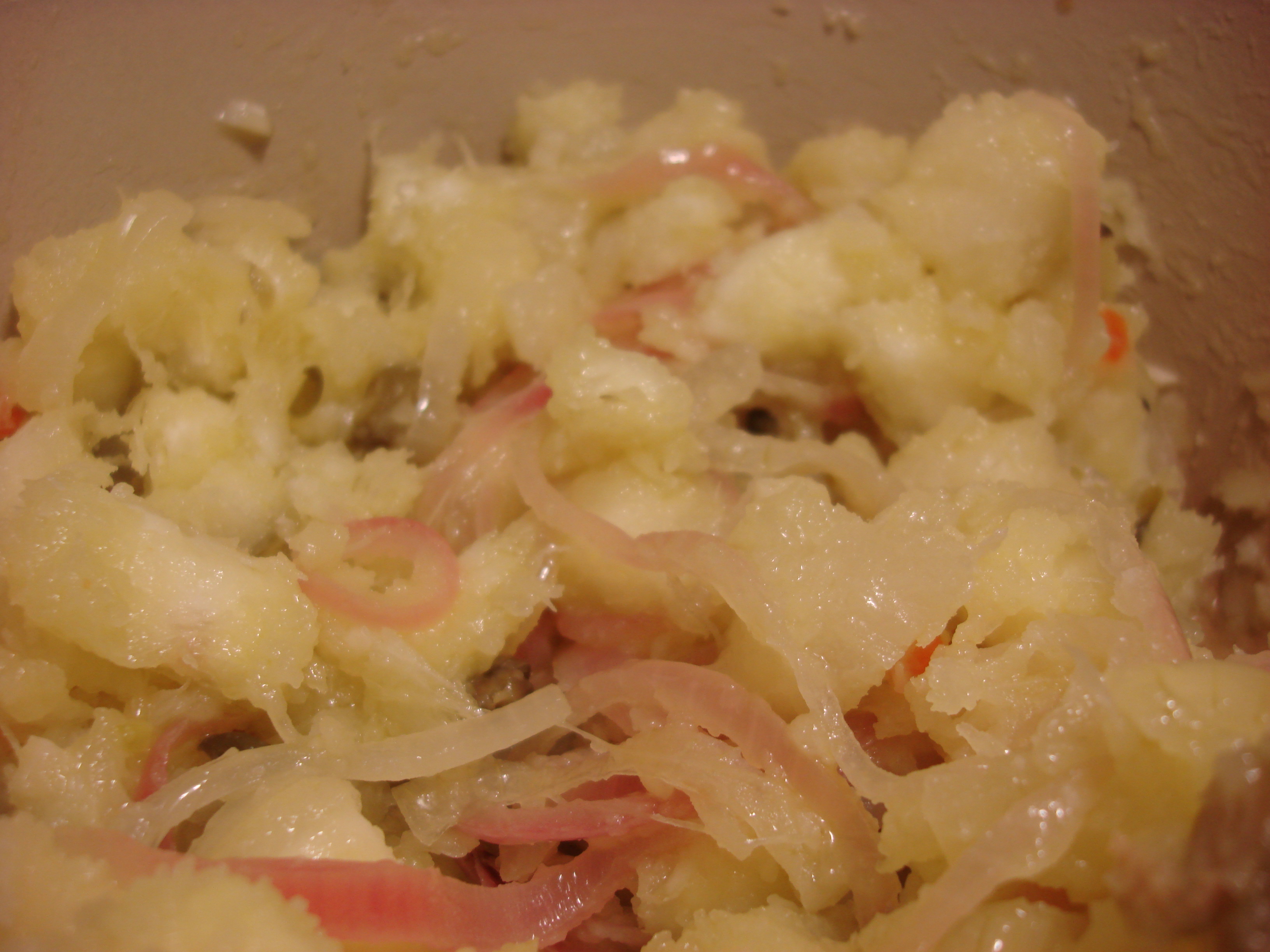 The yuca will have a thick inner fibrous thread which must be removed (it will practically fall out by itself). Then slice the yuca into 1” by ½” slices (just like potatoes for potato salad) into a bowl. You will notice its density and starchiness! Add vinaigrette, mix well and serve. It can be kept in the fridge a few days, but must be brought to room temperature before serving.