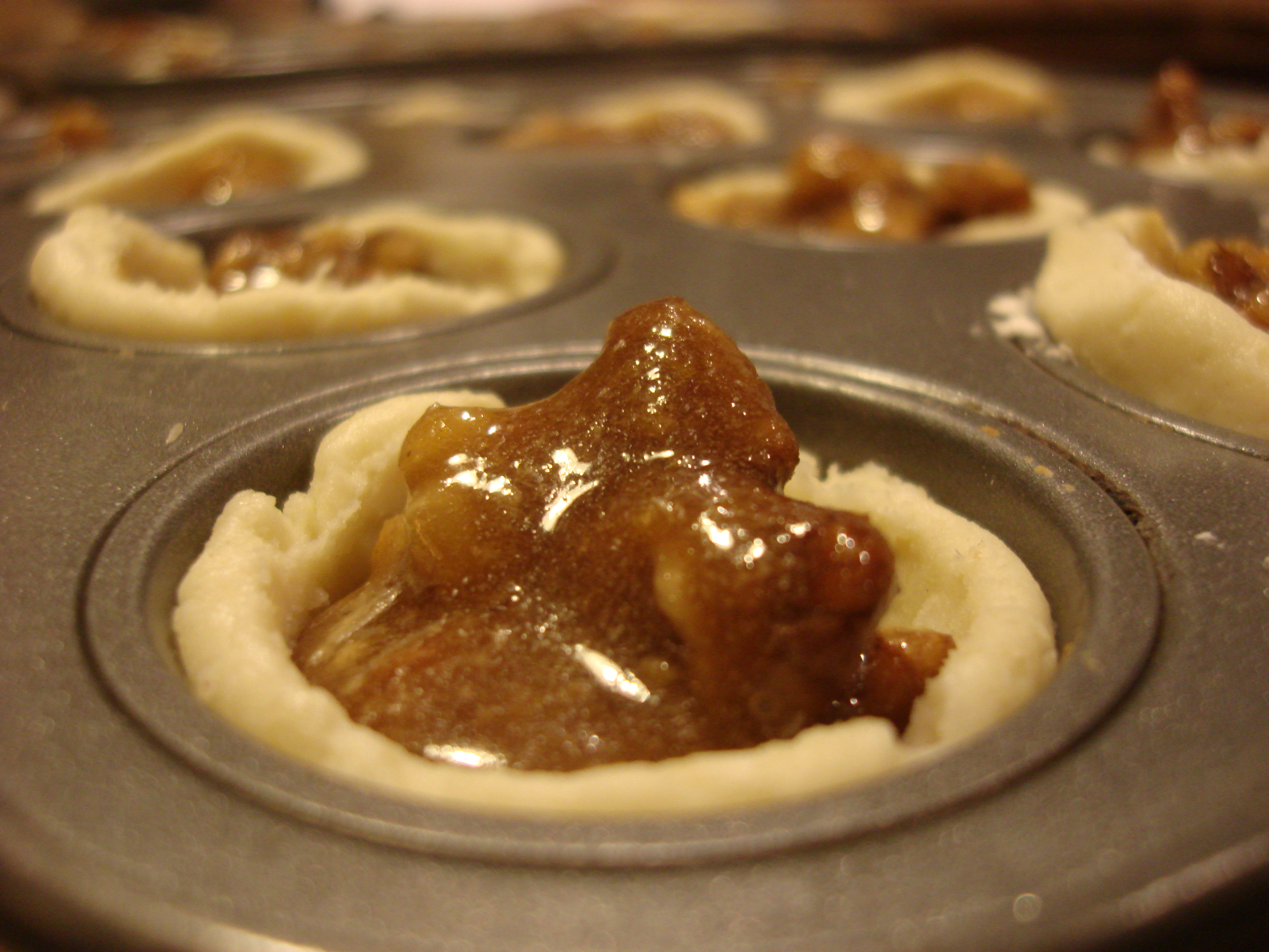 They are not difficult to do (although somewhat time-consuming) and the result is magazine-beautiful little cups that are like bite-sized pecan pies with a cream cheese crust. Rich and just a little bit sticky…they are worth the pain-in-the-neck it can be to wash up the mini-muffin tins.