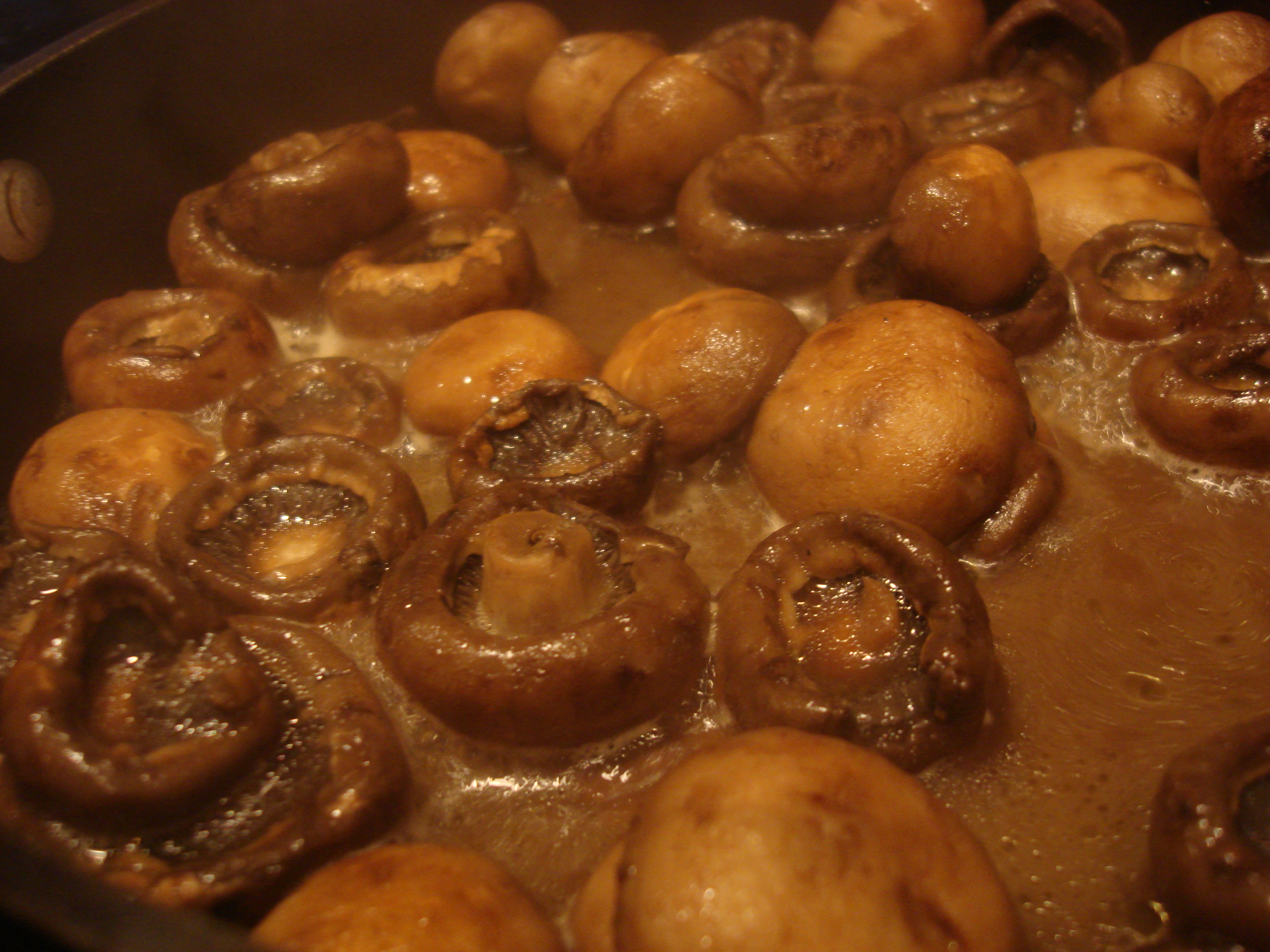 Melt the butter in a heavy bottomed saucepan at medium. When the foaming subsides, add the mushrooms and fry gently, turning to coat. Fry two minutes covered, then uncovered for about another 8 minutes until softened.