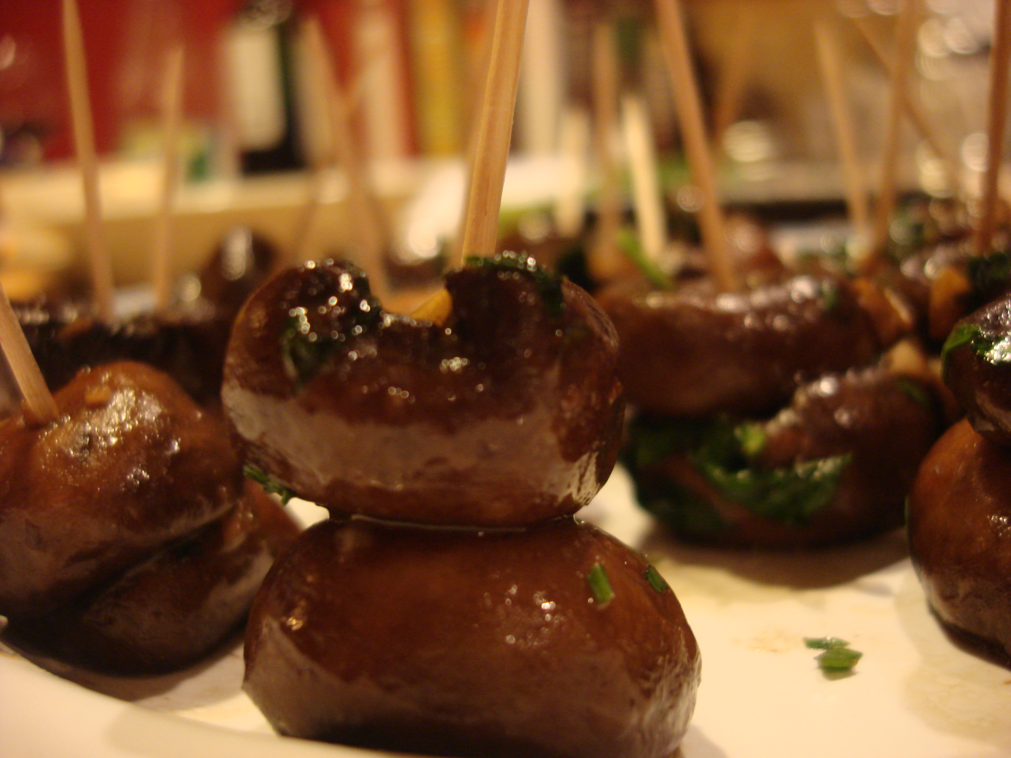 A tumble of mushroomsTapas, for the uninitiated, are small dishes from Spain, used to accompany a post-work, pre-dinner glass of wine, sherry (jeréz), beer or hard cider. They have evolved into an entire food group, a complete culture even, as folks meet at certain bars to nibble on whatever the locale’s specialty is: tortillas, chorizos, shrimp in garlic, croquettes, cured ham…and perhaps stay there, or move on to the next one with a different specialty. Fancy chefs riff on the classics and entire menus are now built around them.