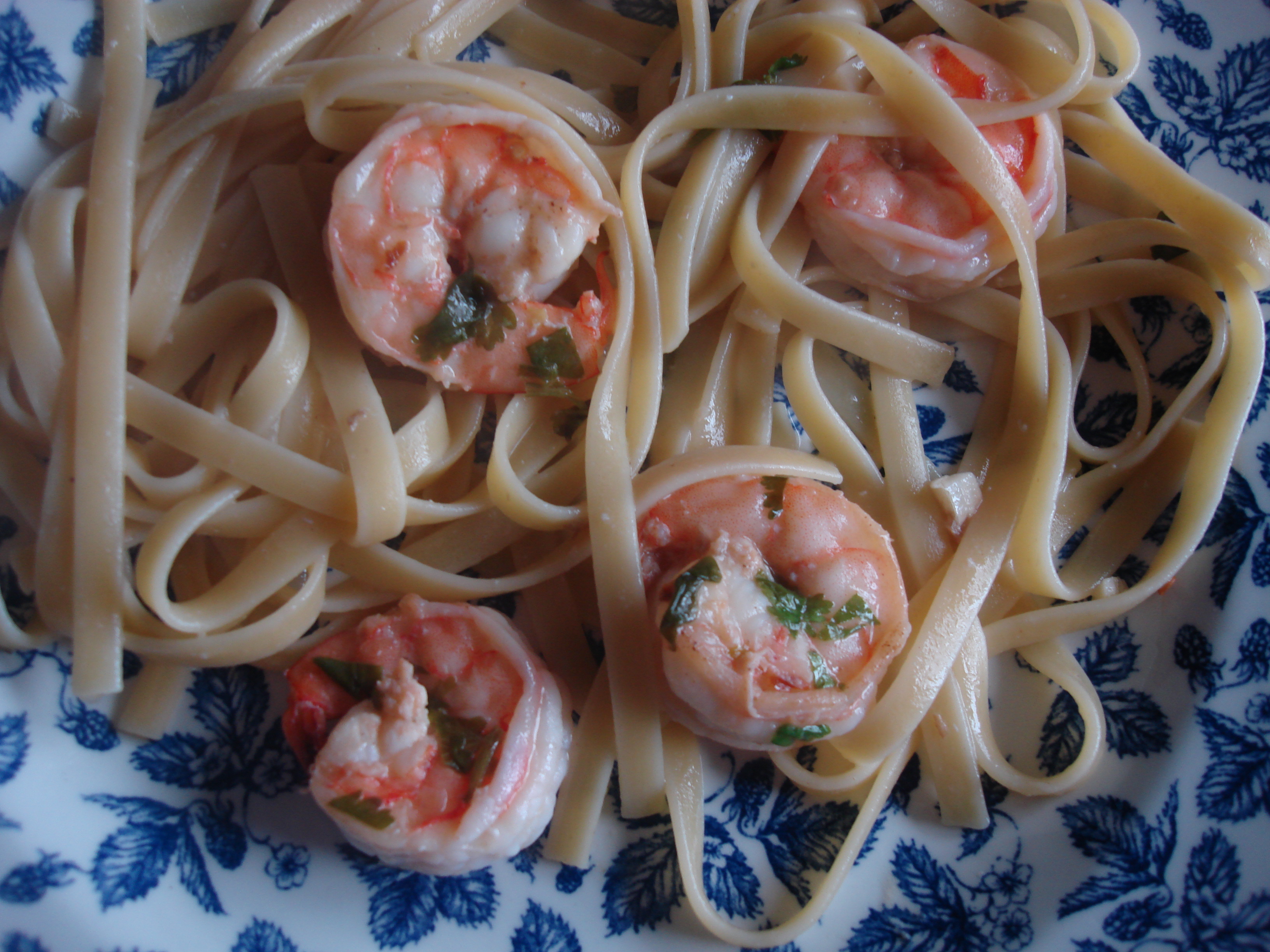 Usually the ratio of butter to oil is reversed, but I am not fond of seafood swimming in butter. And usually the fresh green herb is parsley, but the boy has recently got very, very into cilantro, so we switched that out to to excellent effect. We served it with pasta — taking advantage of the shrimp shells to cook the pasta in seafood broth, but it can be served with rice, couscous, or bread.