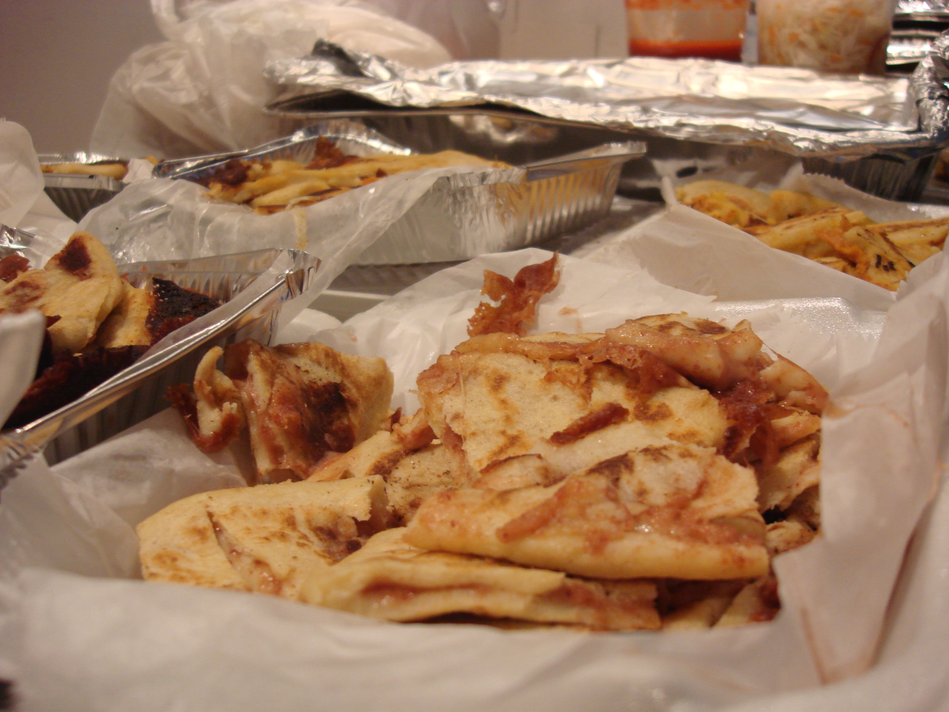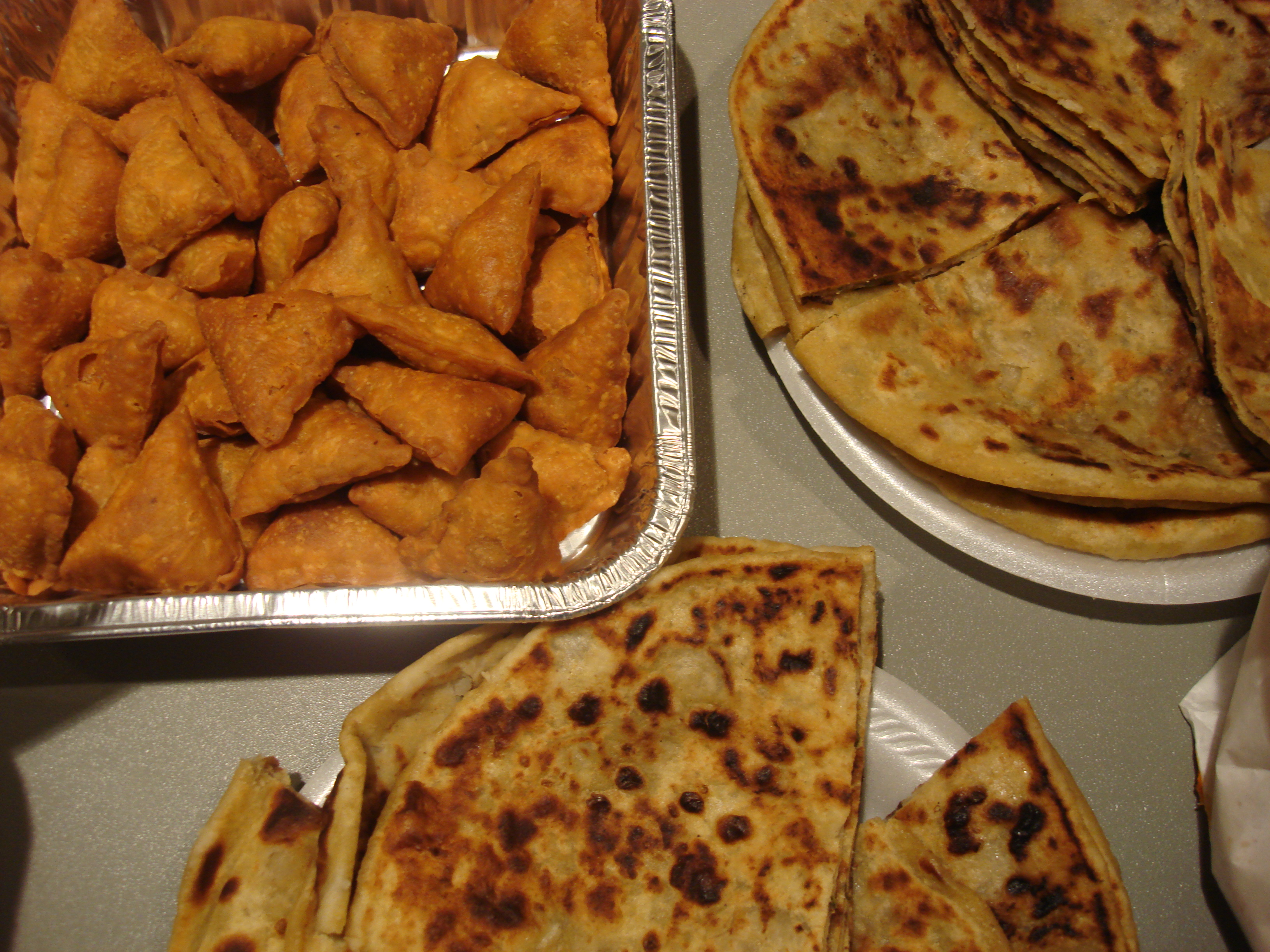 Yesterday (Friday, April 26, 2013) was the Spring Social. It was the best one ever, with homemade Indian samosas, parathas, and pakoras; Korean kimchi; Haitian griot; Angolan sugared peanuts; Czech goulash and dumplings; Dominican baked chicken; Salvadoran pupusas with slaw vinaigrette and hot sauce; empanadas from all over the Latin world; Turkish borek; Spanish tortilla; and dishes more familiar to the American table, like shrimp francese and lasagna…