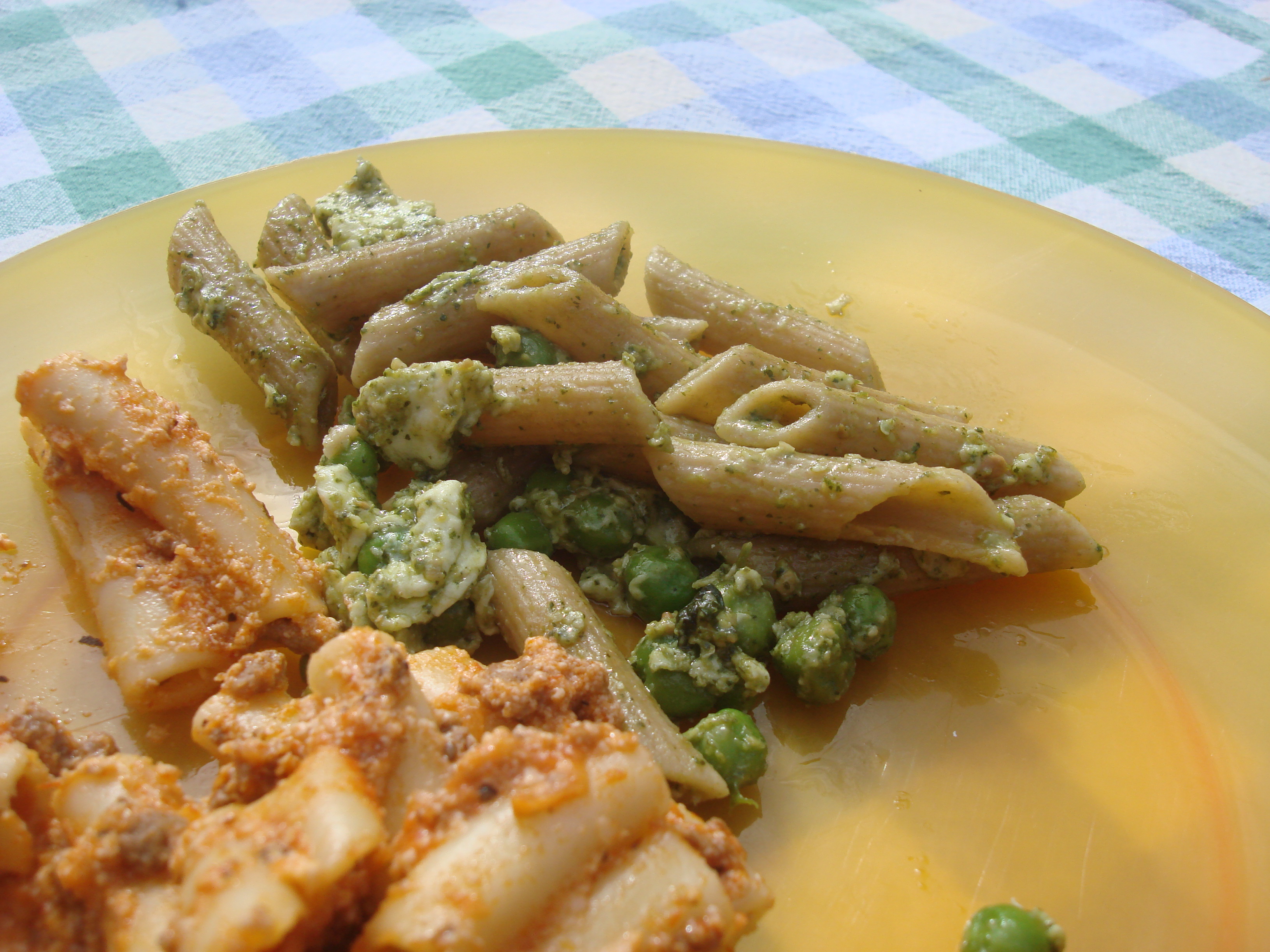 That it was a school garden was also so inspiring because the whole nut allergy thing seems to be exploding in schools and many families are in dire need of ways to amp up the pleasure and keep withing dietary restrictions. This drove me to experiment with nut substitutes. Sunflower seeds were my go-to and worked out so well! They added a nutty flavor and consistency to this cilantro and parsley pesto. I froze the leftovers until such time as I needed them for a potluck at Restoration Farm. On the little guy’s suggestion, we made a cilantro and pea pasta with peas from the farm and our own garden (adding queso fresco – Mexican crumbling cheese)!