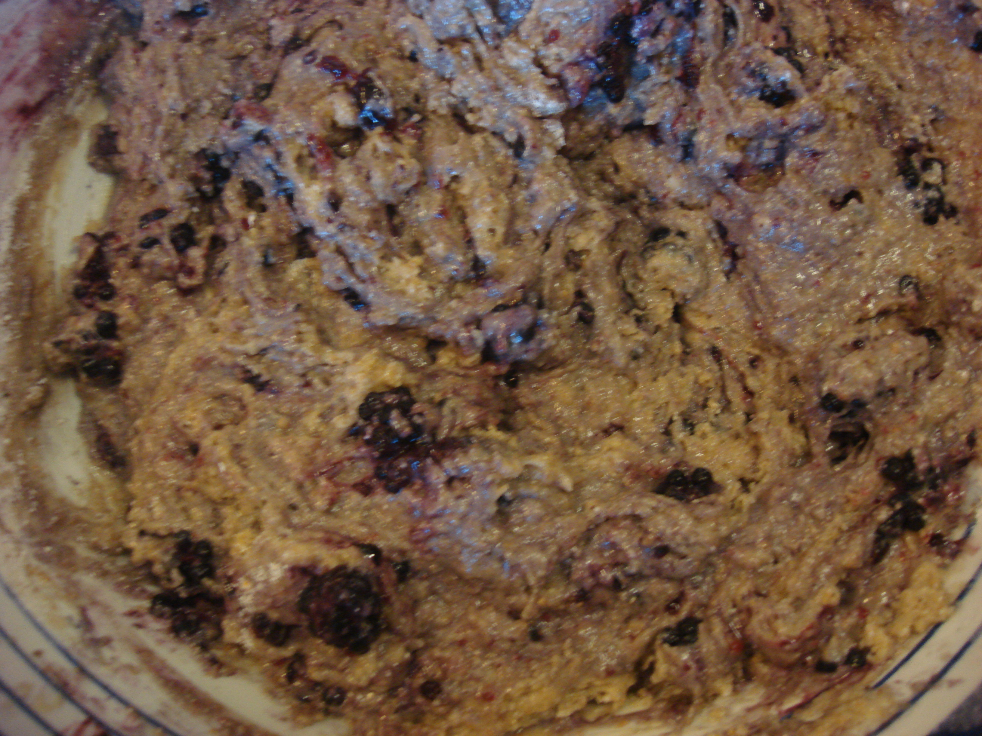 I found a terrific and adaptable little recipe at Simply Recipes, where Elise Bauer has some great stuff going on! I made some changes — primarily using stone-ground flour (why not, as the blackberry seeds already give some crunch so the crunchy flour bits pass unnoticed) and adding two tablespoons of blackberry jam to really up the fruit flavor. I generally add berry jam to all berry muffin recipes and I recommend you try it at least once, especially when using frozen fruit out of season. See below for my version and thanks to Elise for the original recipe. My son baked with me and we ate some and froze the rest. It makes a LOT!
