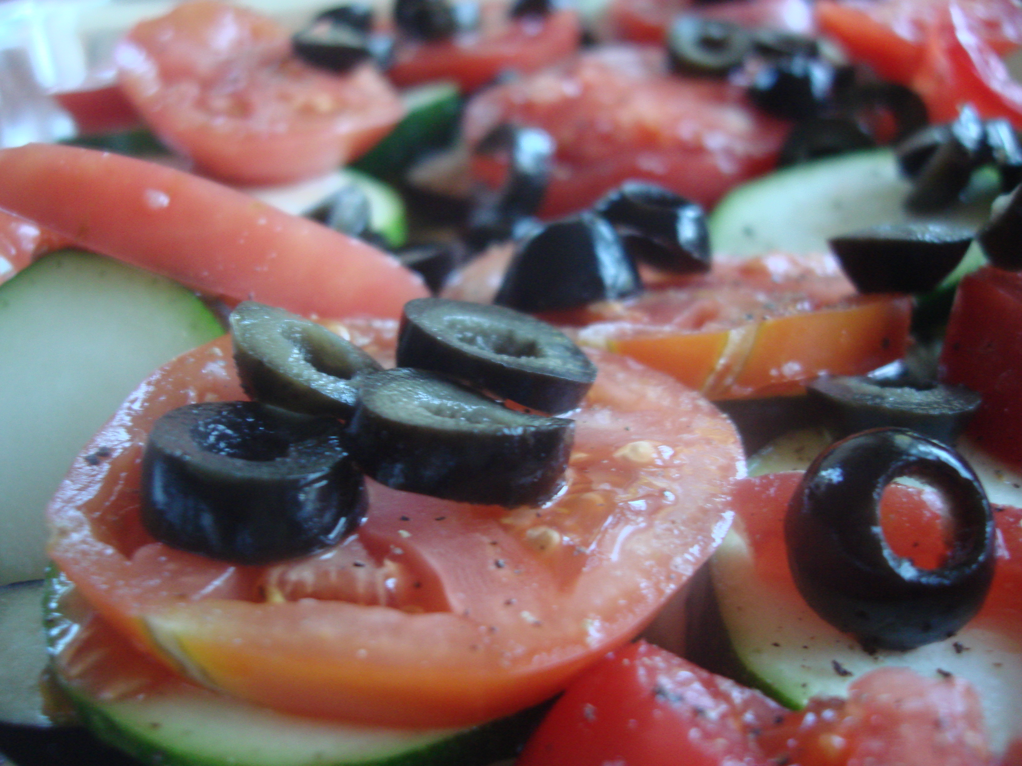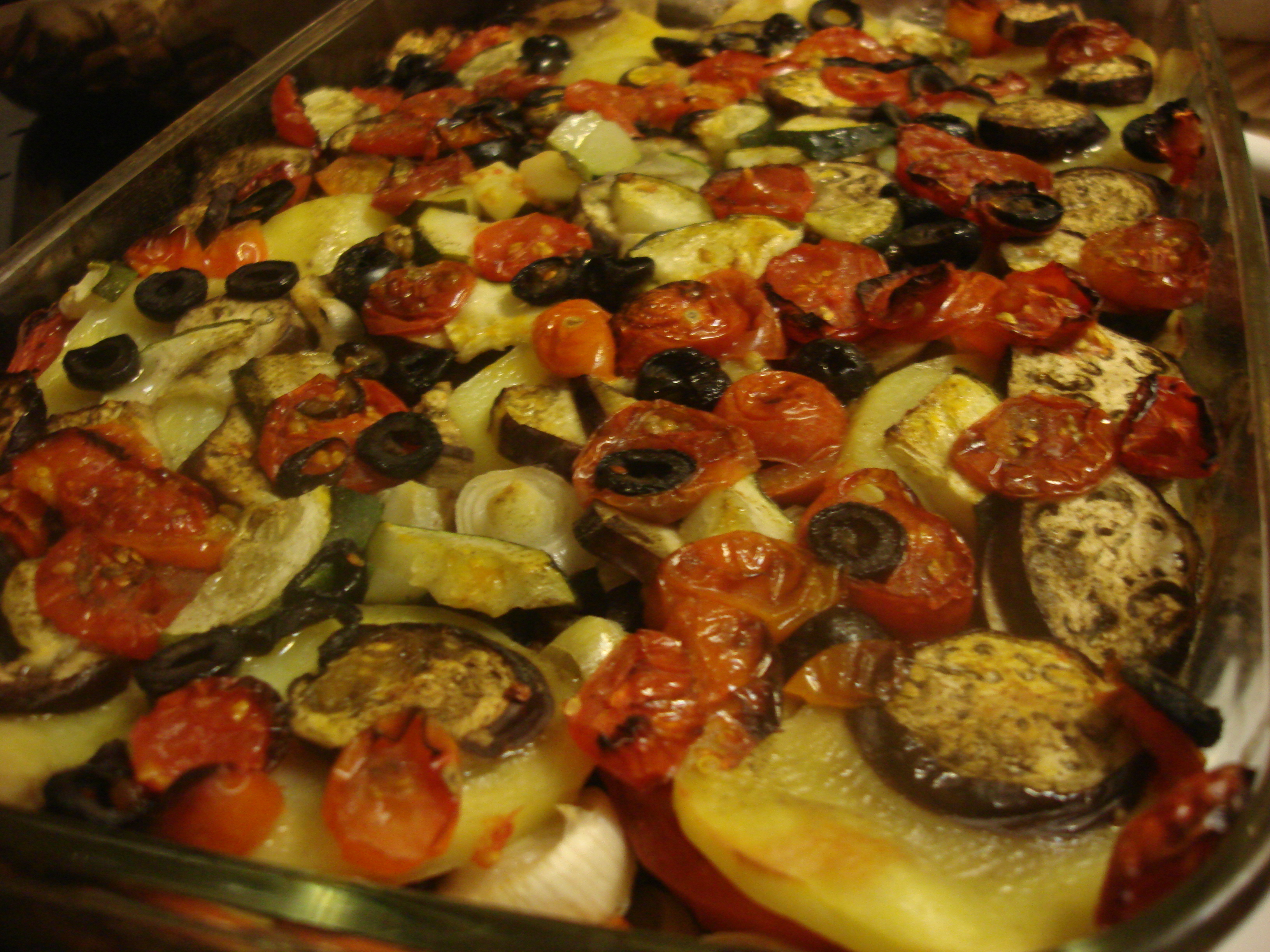 This sounds like something I do fairly frequently with whatever vegges are to hand. I sometimes cover the top with grated cheese and (if it’s for a party) pour over a pot of double cream.instead of using olive oil.