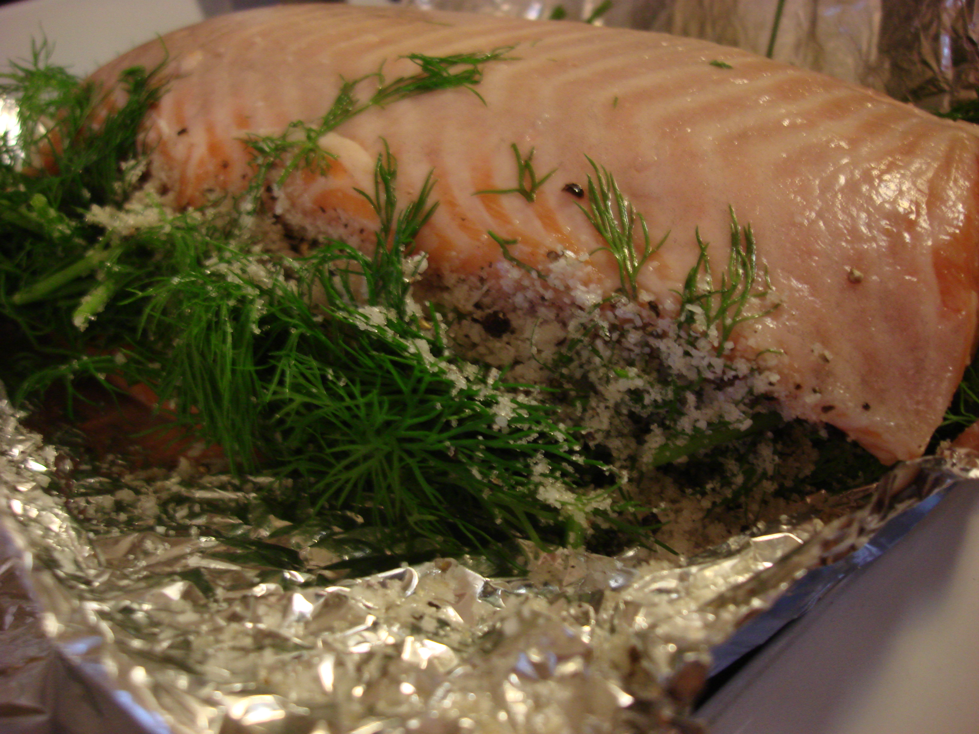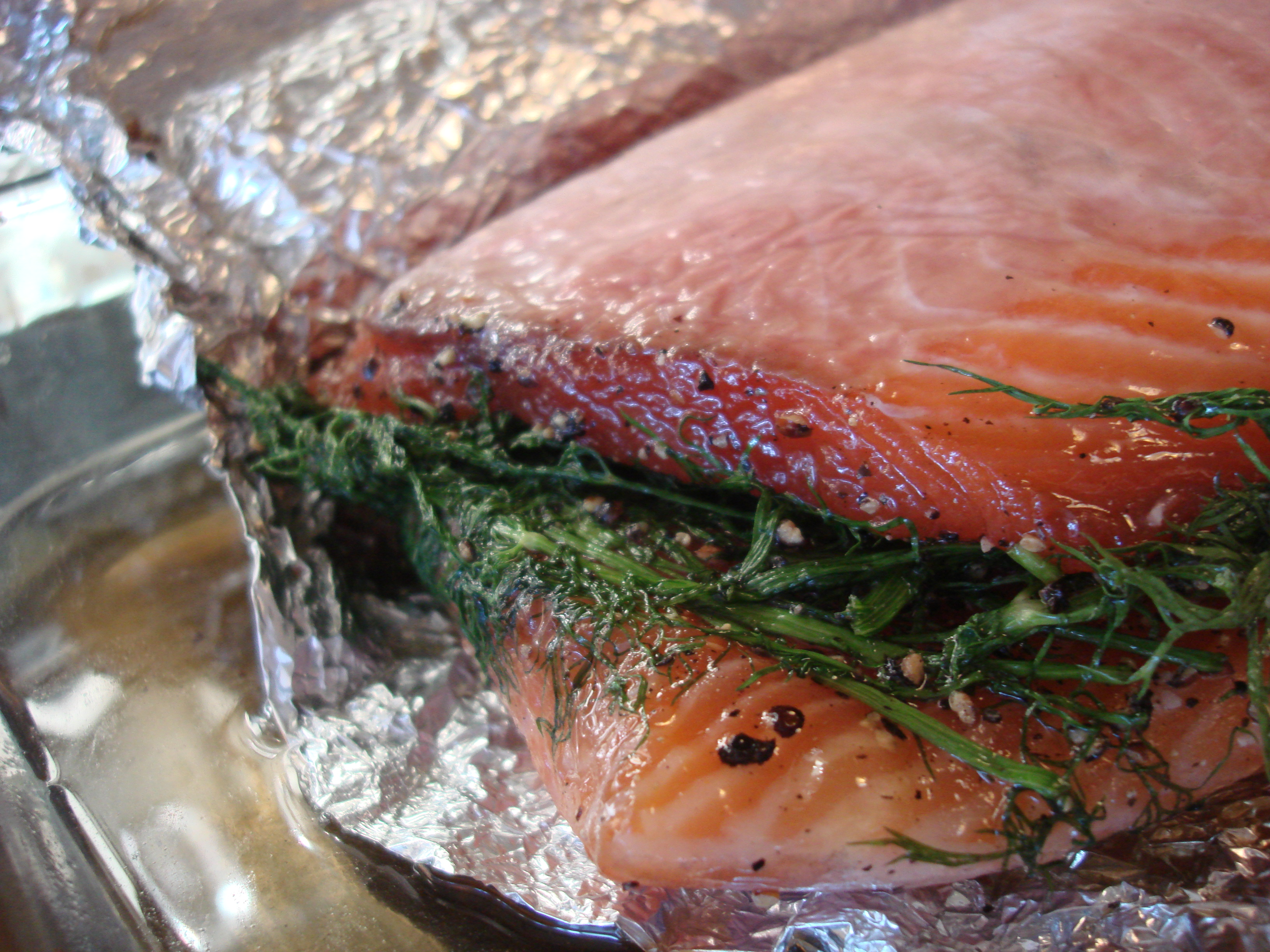 Place one filet skin side down on a large sheet of aluminum foil in a glass, enamel, or stainless steel baking dish. Place the dill on the fish. In a separate bowl, combine the salt, sugar and dried peppercorns and sprinkle the mixture evenly over the dill. Top with the other side of the fish, skin side up. Wrap with the aluminum foil and set a heavy platter – bigger than the salmon – on top and weigh down with a couple of bags of beans.