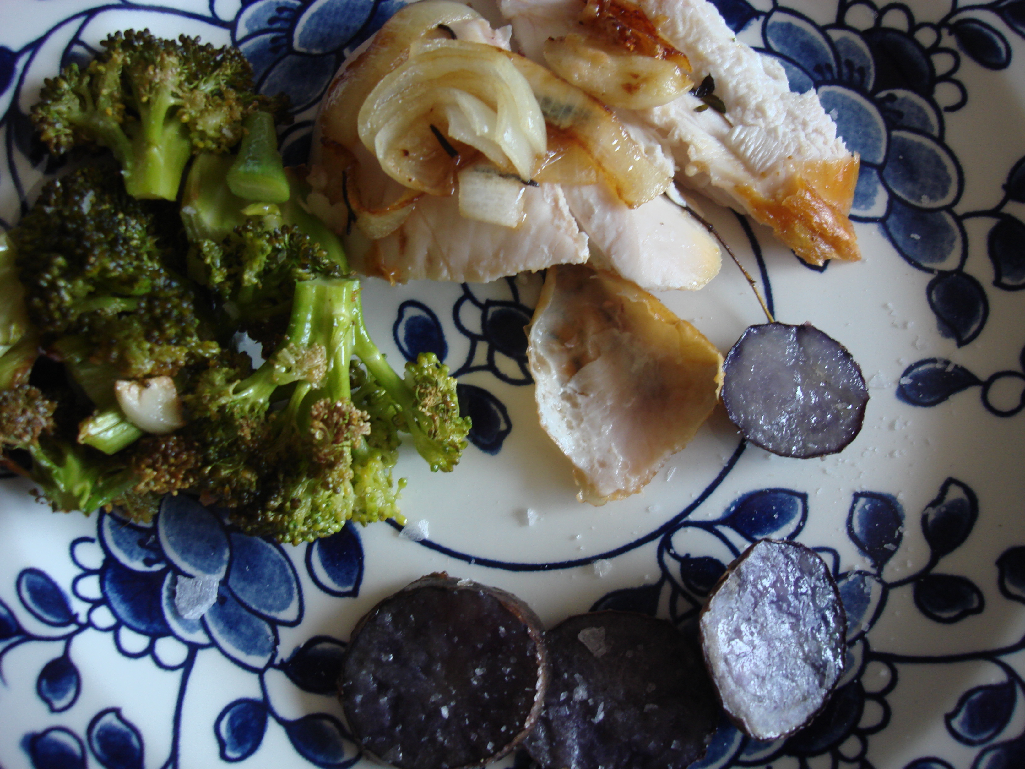 For the original recipe (with ramps and capers) and video click here. I changed the seasonings to suit what I had on hand and then roasted broccoli and new purple potatoes in the toaster oven (20 minutes at 350º) with smashed garlic and a generous glug-glug of olive oil and that was it.
