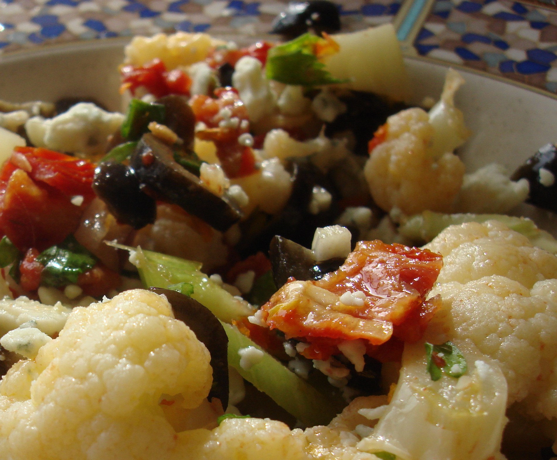 Transfer the cauliflower to a large bowl and add the celery, olives, parsley, garlic, onion, tomatoes and pepper flakes and toss gently but thoroughly. Sprinkle lemon juice, zest and salt and mix again. Drizzle in the olive oil, then cover and marinate at room temperature for 30 minutes or refrigerate until chilled. Fold in the cheese just before serving.
