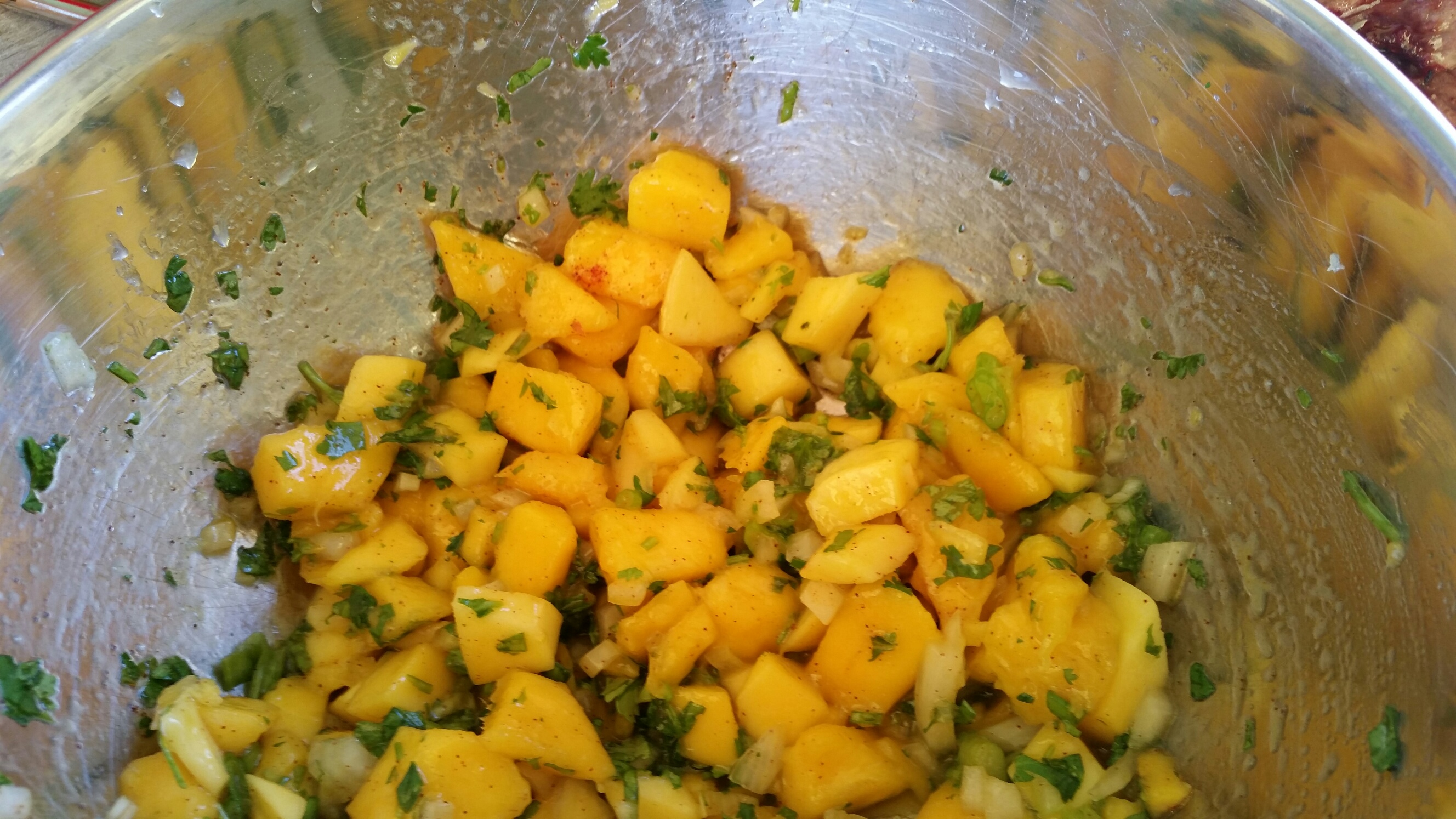 I decide to surprise everyone with a different sort of dressing for the steak: a mango chimichurri salsa, a riff on the parsley-based Argentinean salsa for steeak.