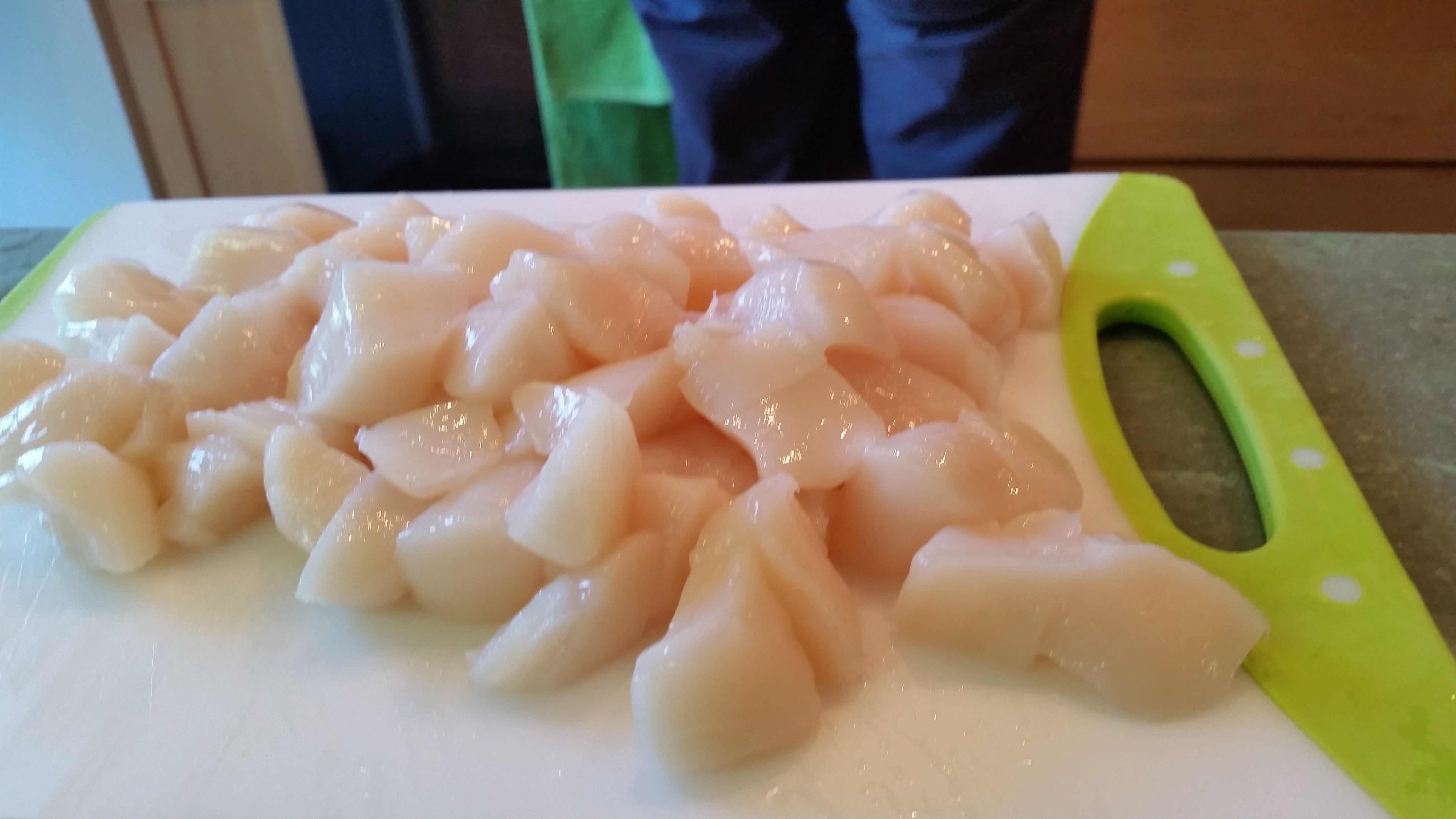 3/4 pound bay scallops or sea scallops cut into 1″ chunks