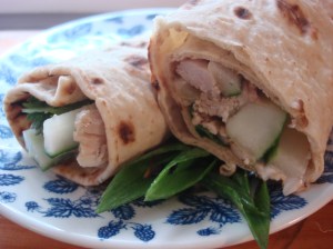 Spread a wrap or your choice with mayonnaise. Add cucumber, sliced lengthwise, pieces of chicken, slivered scallions and cilantro. Add a sprinkle of lime/sesame oil and a drizzling of Asian Stir Fry Sauce https://hotcheapeasy.wordpress.com/?s=asian+stir+fry+sauce roll up and serve.