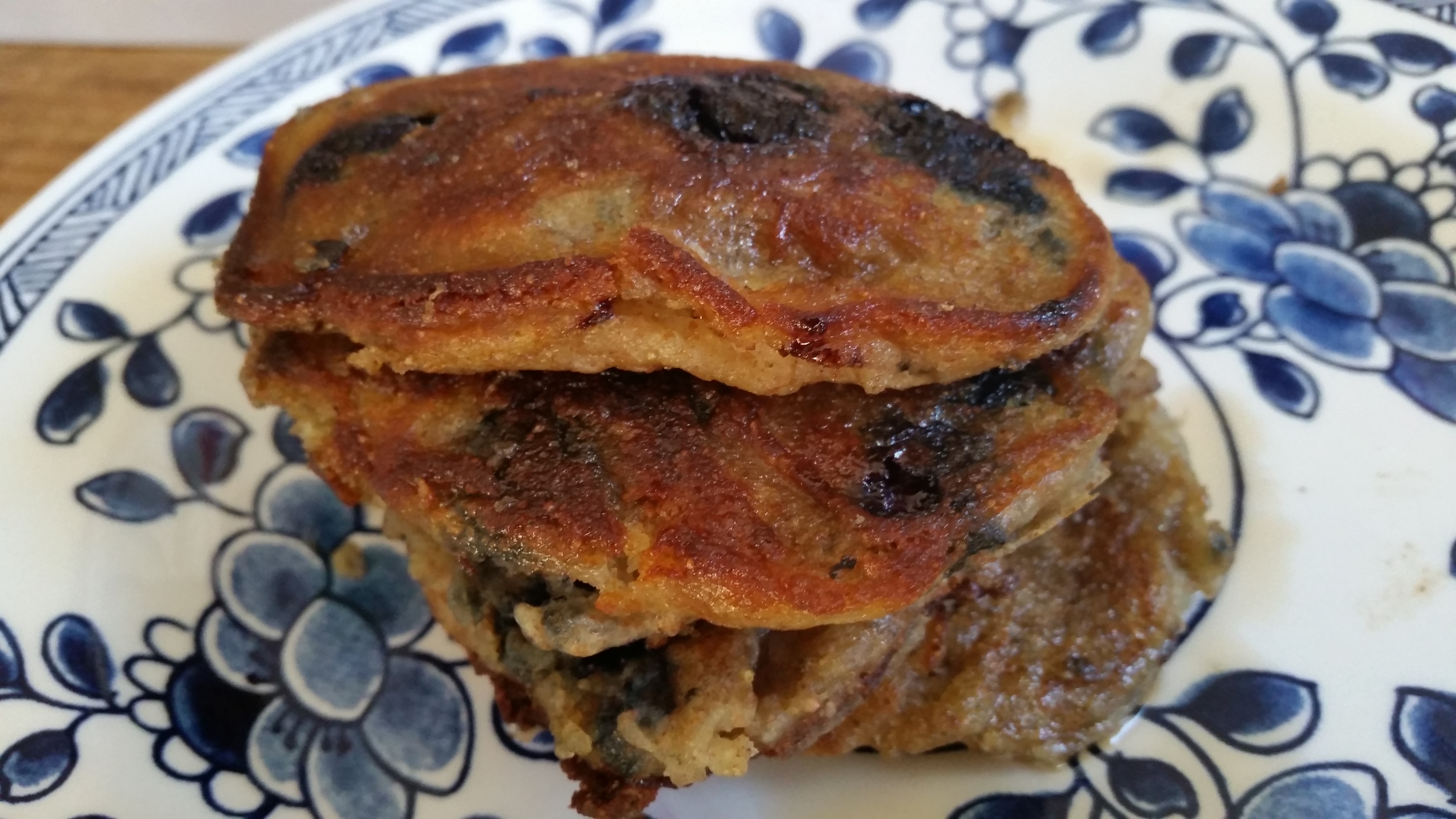 The original recipe was for 14 pancakes, so we halved most (not all) of the ingredients, keeping the cinnamon and vanilla at full-strength, and adding homemade cranberry-blueberry jam.