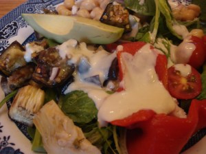 Roasted eggplant and friends on whole wheat English muffin. Don't worry about the verticality; it smushes down to a reasonable, biteable size.