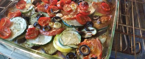 *Notes: if you have time, sprinkle the slices with a pinch or two of salt, put in a colander and put a weighted bowl on top to squeeze out extra moisture – it becomes less absorbent that way – 15-30 minutes. This step is not really necessary with really tight-skinned, firm, fresh eggplant).
