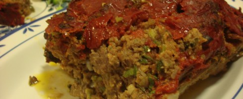 Place in 8×5 loaf pan and bake for 40 minutes. Remove from oven and spread the reserved tomato paste evenly over the top. Return to oven and finish cooking (another 5-15 minutes – until a meat thermometer inserted in the center reads 140°F). Allow to cool slightly before serving.