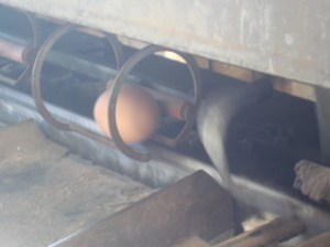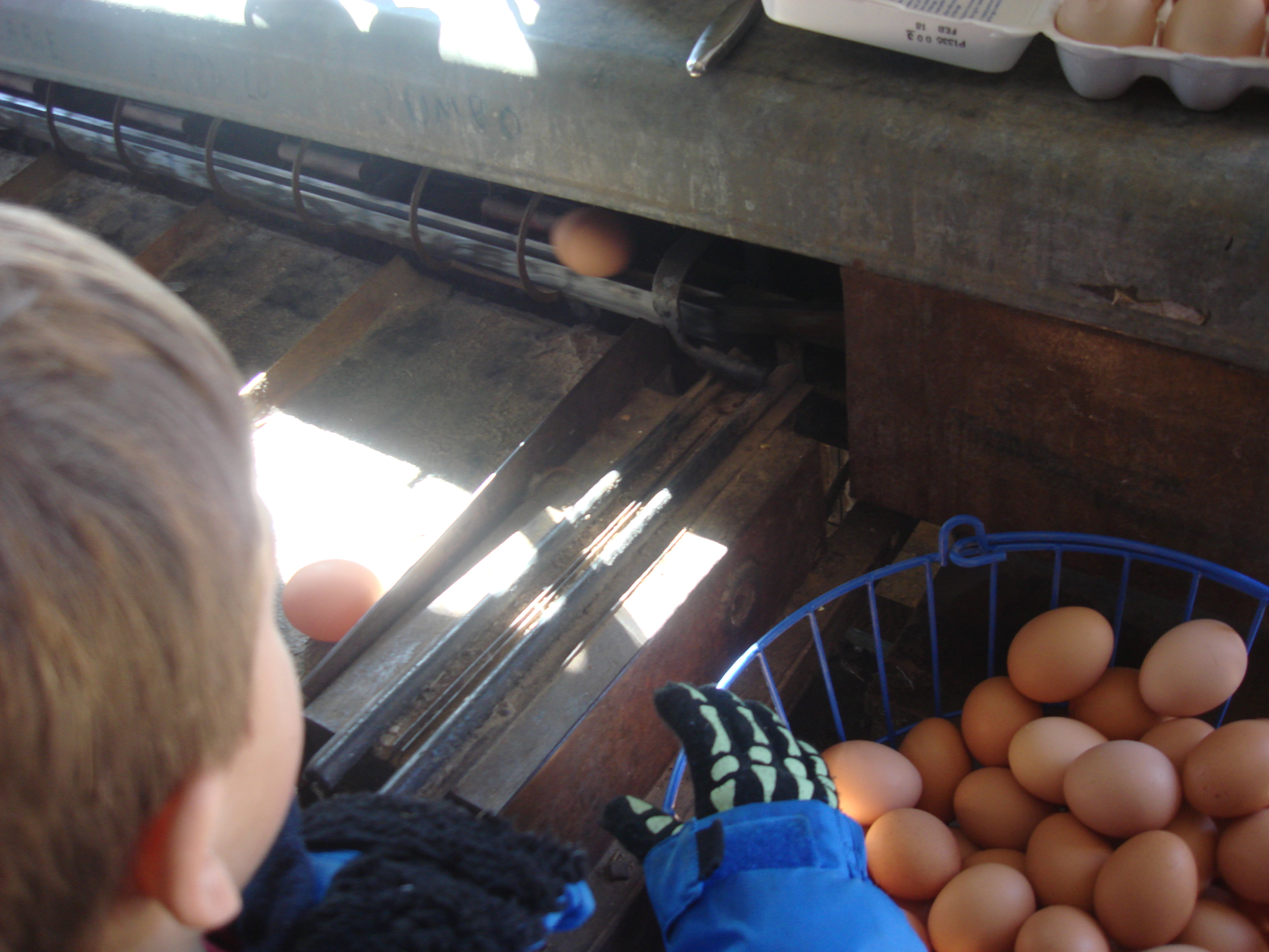 This time I hit pay dirt! The last few times I have stopped for eggs, Leandro was asleep in the car, so he didn’t get to see the cool old egg sorter in operation. This time he was wide-awake – on fire and crunchy from too much enforced restaurant sitting, in fact – and the sorter was in use to sort eggs for the cognoscenti stopping by for the their weekly supply. So owner David Wines was kind enough to let the little guy sort his own eggs…you roll them onto a little chute and they travel along a line of egg-sized scales measuring jumbo, extra-large, large, etc. and the egg rolls off when it tips the correct weighted scale.