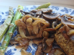 When onions have cooked and browned, remove and set aside. Add mushrooms to skillet with existing butter (add more if desired) and cook at medium –high, stirring occasionally, until mushrooms have released their liquid (about five minutes), liquid has evaporated somewhat and mushrooms are tender and browned. Add more butter, if desired (I desire a lot of butter!), return onions to skillet and stir to incorporate. Add Worcestershire sauce to taste as desired, a teaspoon or so at a time. Serve atop cooked burgers, grilled meats or vegetable or veggie/bean burgers.
