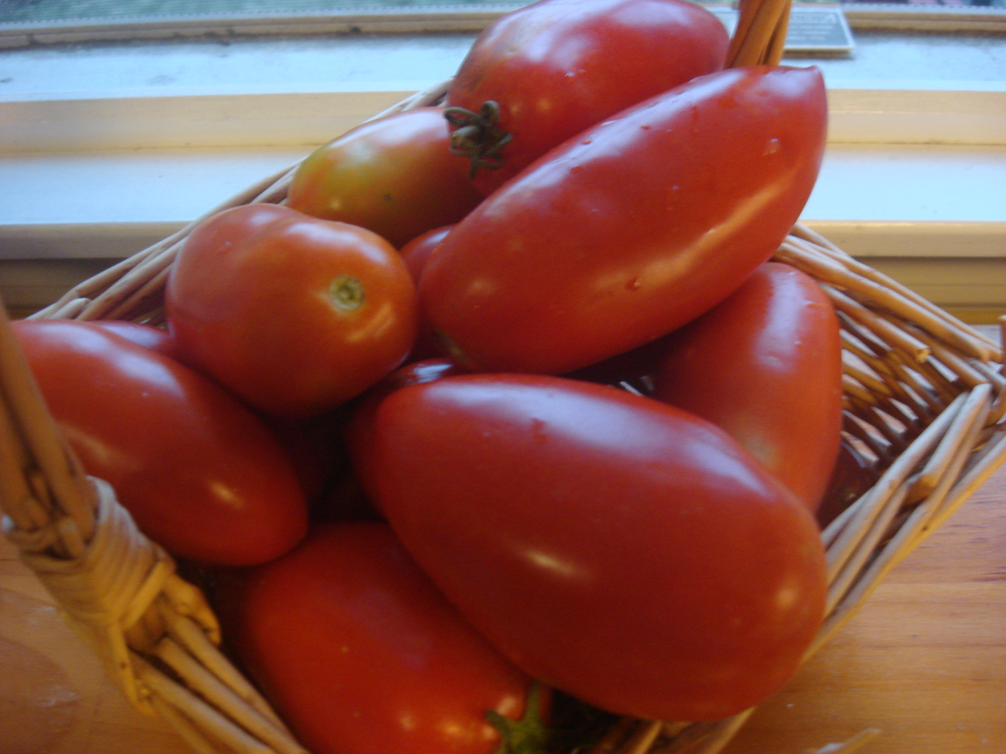 *To blanch and peel tomatoes: Bring two quarts of water to a boil. Meanwhile, core the tomatoes (take out the stem and white core with a paring knife) and prepare a large bowl of ice water. When the water boils, drop tomatoes in. In two minutes (or less) you will see the skin begin to peel back or split. Remove each tomato as this happens and drop in ice water. When tomatoes have cooled, take them out of the ice water and peel (the skin should come off easily). They are then ready to cook down, or freeze in freezer bags for later use (later can be as long as next spring! and you don’t have to peel them if you are freezing for later use).