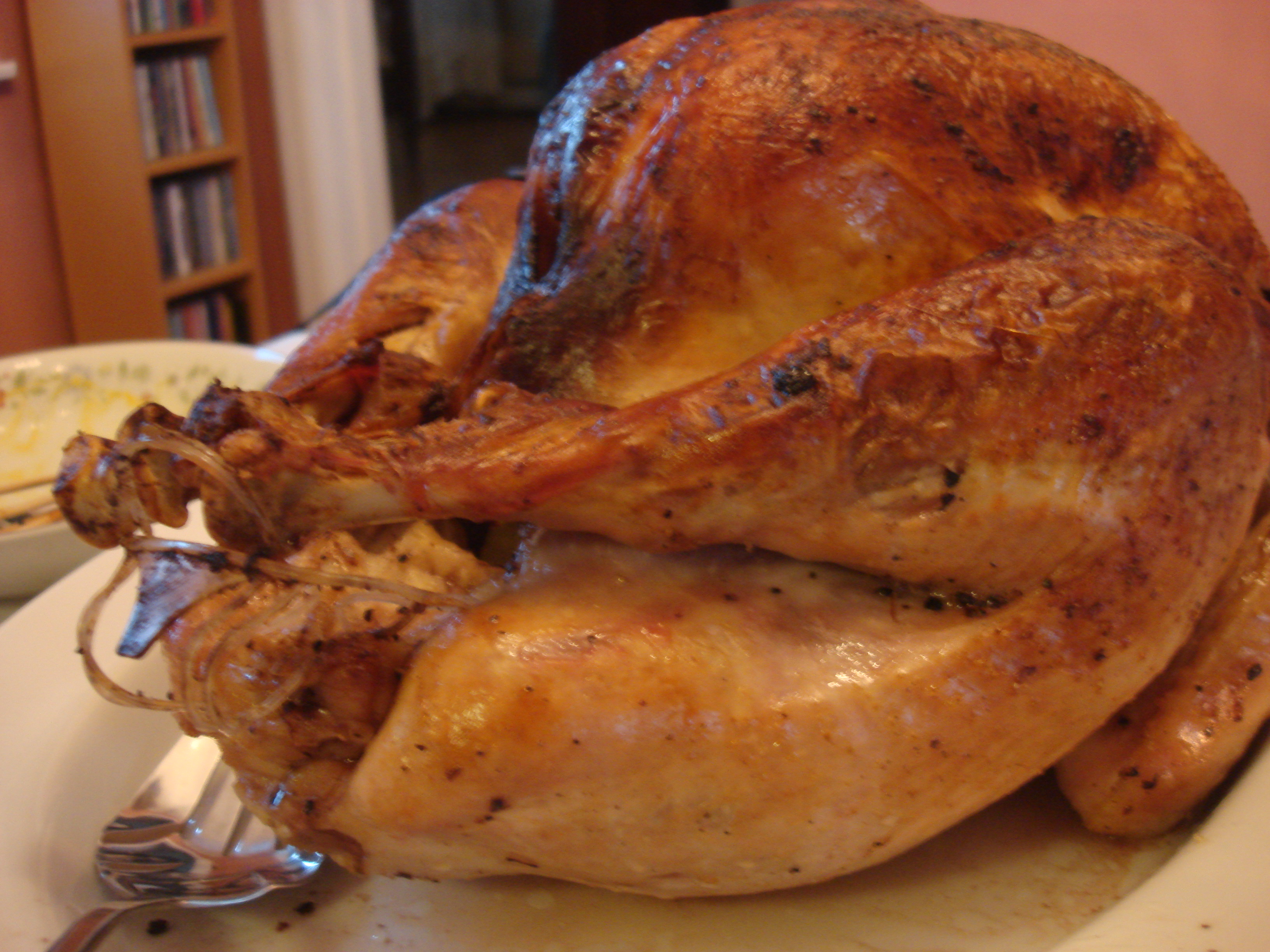 Important note: We also had a pop-up thermometer in the breast, which popped up waaaaay before the thighs were cooked (a typical problem and the reason why the breast on roasted whole turkey is often dry and overcooked. We simply turned the turkey over onto the breast and kept roasting, sacrificing crispy skin for juicy breast. You decide what you want – we may actually cook the bird in pieces next year – but having two different thermometers for the two major zones of the bird was very helpful).
