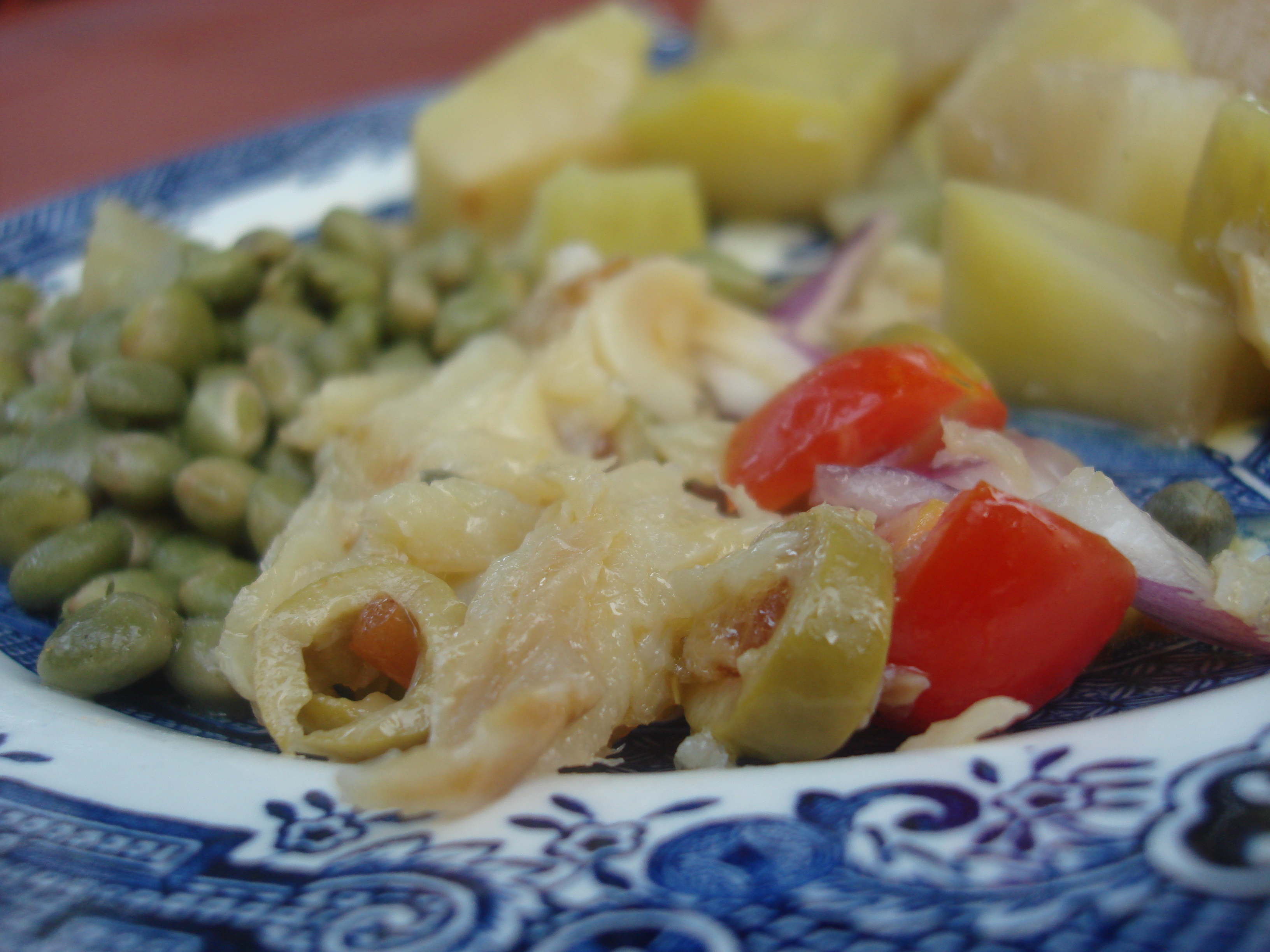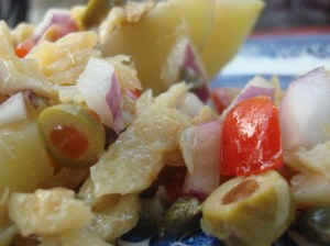- Dressing — 4 Tbs olive oil;1 tsp capers; 10 pimiento-stuffed olives, sliced; ½ cup red onion, chopped; 10 grape tomatoes, quartered (Plus additional olive oil for drizzling and salt to taste).