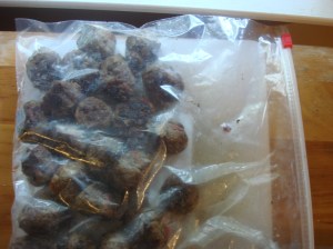 To freeze, place cooled meatballs in a freezer bag. Lay the bag flat on a plate and stick in freezer so the meatballs don’t freeze stuck together. When completely frozen through, remove plate, shake the bag to unstick meatballs, squeeze air out, and leave bag in freezer. Use within three months (or before freezer burn sets in!)