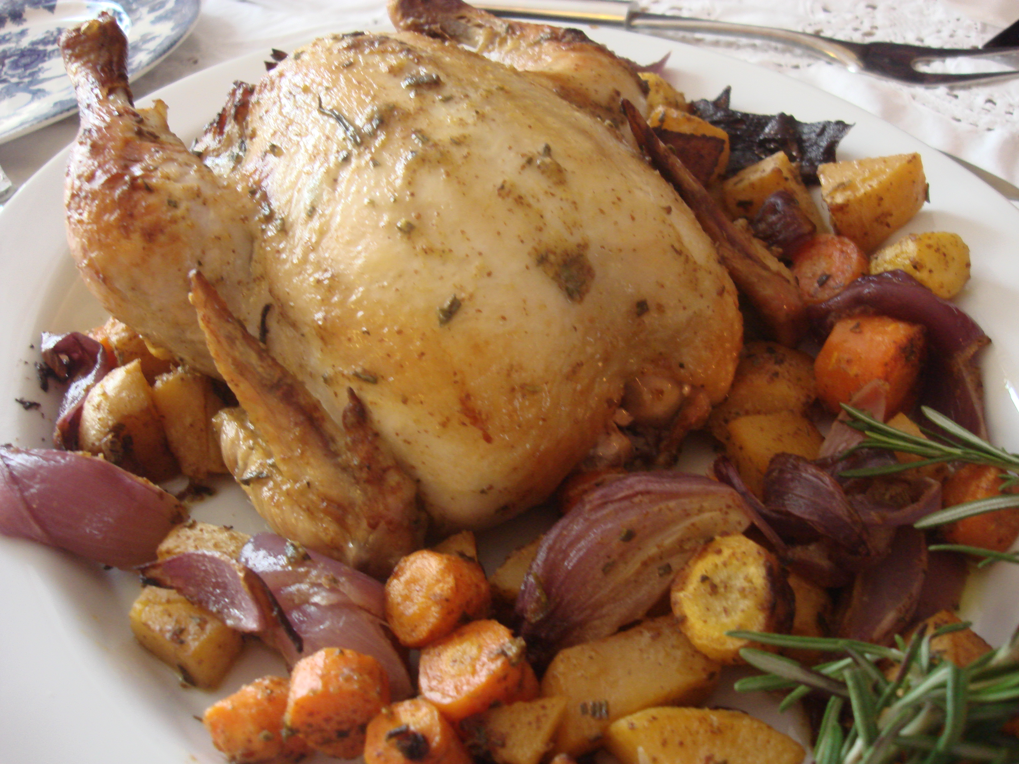In a baking dish big enough to hold your quantity of root vegetables you have, place all the vegetables. Add a generous knob of butter (figure 1.5 Tbs for a 8×8 oven dish worth and go up a half Tbs for each inch larger). Pour 2 Tbs of olive oil over that. Stir everything around to coat and add more oil as you see fit.