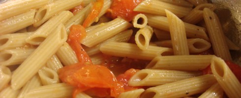 The tomatoes (Campari’s which I bought out of season because I couldn’t resist the clearance price) had none of the rich acidity and fullness of a summer tomato, but grilling and roasting add some depth of flavor and the garlic and vinegar give a very pleasant tang. So, should you succumb to a good price or simply the need for a tomato that didn’t come out of a tin during the winter months, this recipe will enhance a lackluster product. To my surprise, Leandro really dug this pasta and ate the extra serving I had intended for my own lunch the following day.  I should have been totally pleased and delighted and flattered, but this imperfect Mommy was kind of annoyed. And frightened. If he eats like this at four, how much is he going to eat as a teenager?